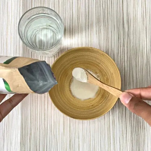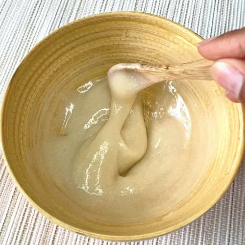 - Disperser 15g de poudre (7 cuillères à café) dans 50ml d’eau chaude et agiter énergiquement jusqu’à obtention d’une crème homogène. A la place de l'eau pure, vous pouvez utiliser l'infusion de Tisane TONIQUE pour booster l'action de votre soin.