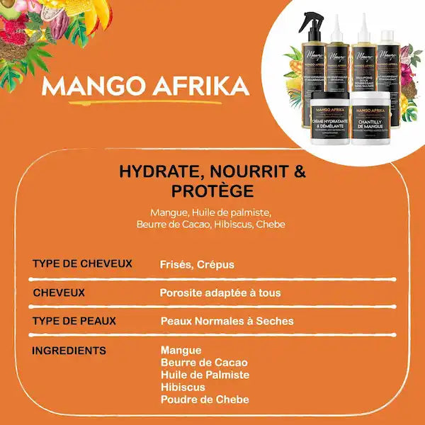 Extrait de Mangue : Riche en acides gras, insaponifiables, antioxydants, le beurre de Mangue nourrissant et adoucissant apporte de la brillance aux cheveux et lutte contre les pointes fourchues. Il hydrate et assouplit la peau et lutte contre le vieillissement cutané.