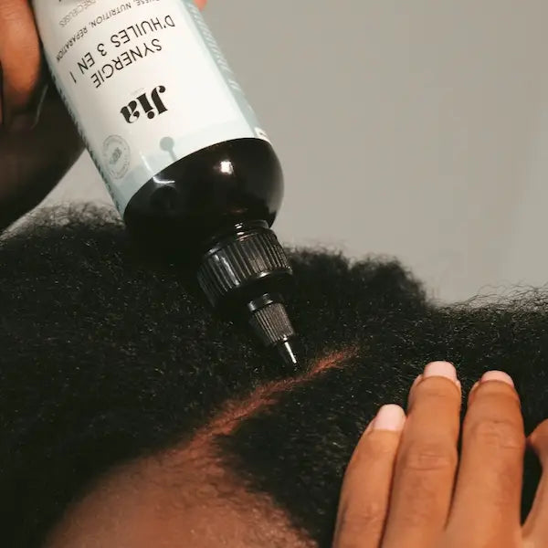 Utilisez la Synergie d’huile 3 en 1 en complémentarité avec la Lotion Croissance JIA PARIS. Appliquez la Lotion puis la Synergie sur le cuir chevelu 2 nuits par semaine en séparant vos cheveux en 4 parties ou plus selon votre préférence afin d'appliquer le soin au plus près des racines chaque matin. Massez le cuir chevelu (avec la Brosse stimulante JIA) pour favoriser la pousse.
