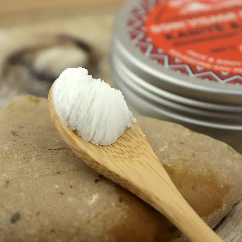 Beurre de Karité : Riche en acides gras essentiels, insaponifiables et vitamines, le Karité protège, nourrit, renforce, aide à la cicatrisation, améliore la fermeté et l’élasticité de la peau et fait briller les cheveux.