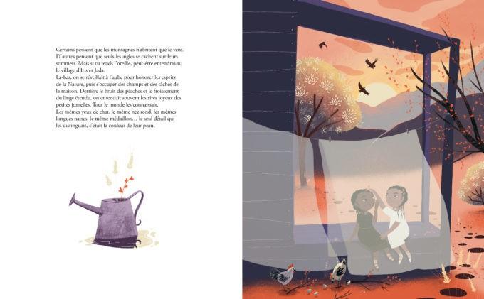 Iris et Jada sont des sœurs jumelles. Elles s’entendent à merveille et partagent tout : les mêmes yeux de chat, le même nez rond, les mêmes longues nattes, le même médaillon… le seul détail qui les distingue, c’est la couleur de leur peau.