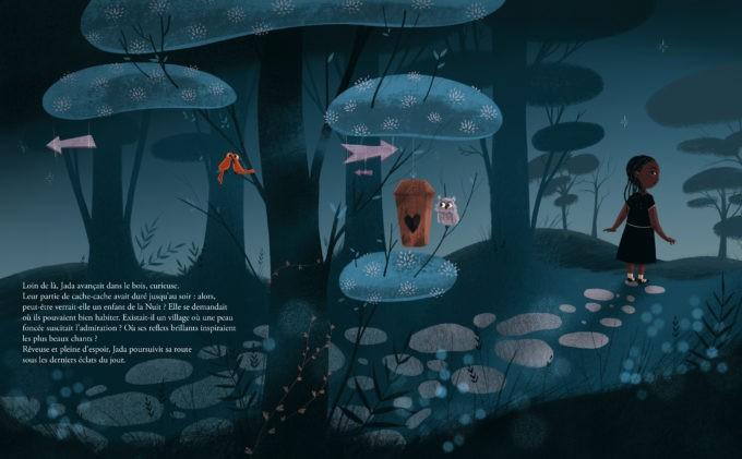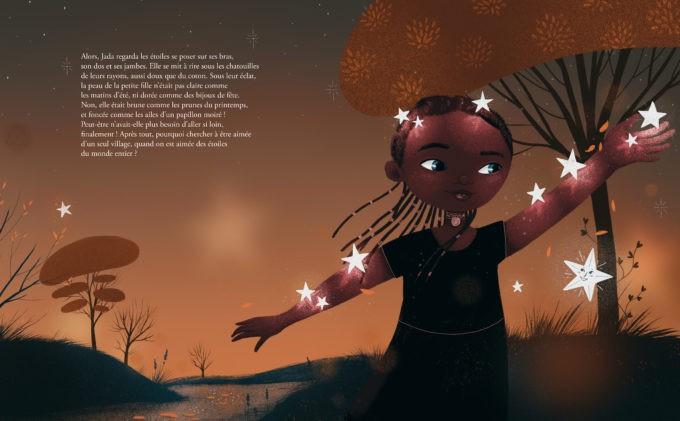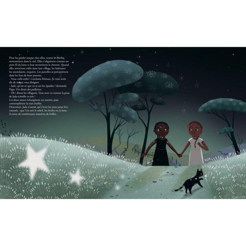 Celle d’Iris est aussi claire que l’acacia tandis que celle de Jada est aussi foncée que le cacao. Dans leur village, la première est sans cesse complimentée tandis que l’autre est moquée. Un jour, Jada se lasse de ces remarques et décide de s’aventurer dans la forêt. Là-bas, elle espère rencontrer ces « enfants de la Nuit » à qui sa grand-mère ne cesse de la comparer…