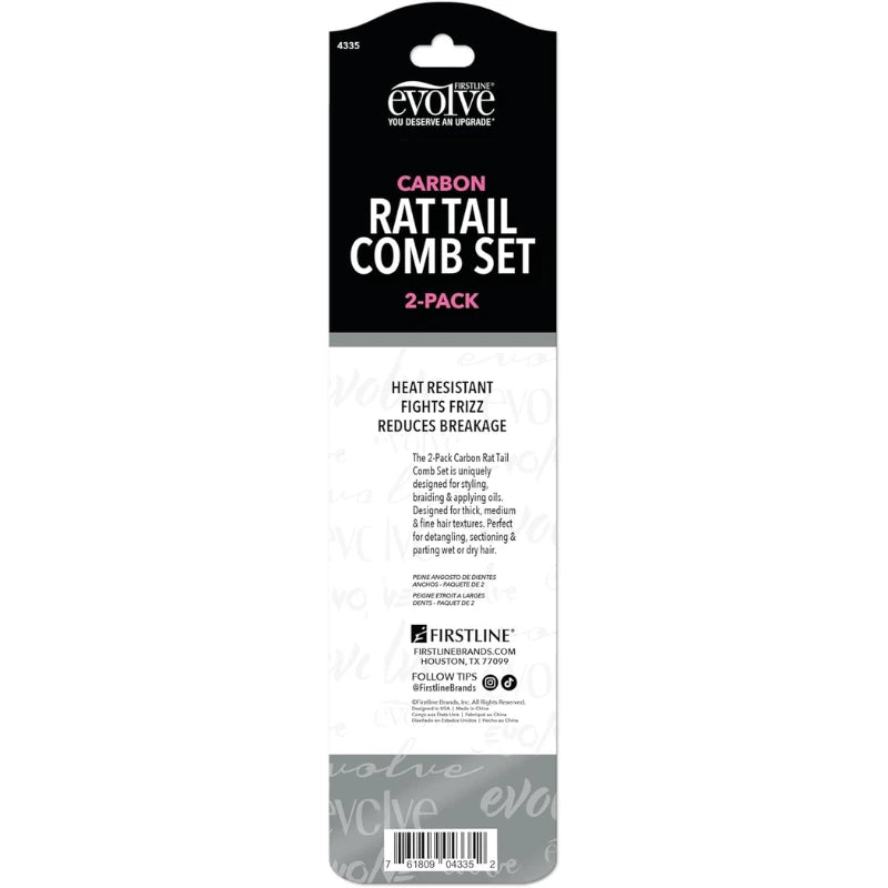 Le lot de 2 peignes queue de rat Evolve® est un indispensable de votre trousse capillaire. Pensé pour les cheveux bouclés, frisés, crépus, il facilite le sectionnement, le tressage et la définition des raies.