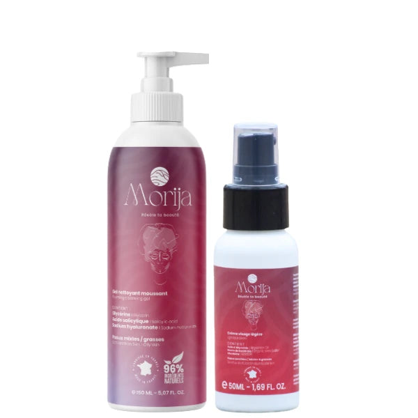 Redonnez éclat et pureté à votre visage avec le Duo Visage Propre et Teint Lumineux de Morija Care spécialement adapté pour les peaux mixtes à grasses.