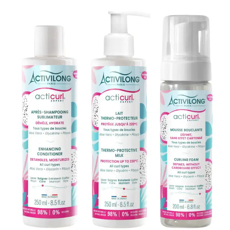 La gamme Acticurl Expert d'Activilong est spécialement conçue pour répondre aux besoins des cheveux bouclés, frisés. Retrouvez trois soinscomplémentaires pour sublimer, protéger et définir vos boucles au quotidien avec des formules riches en aloe vera, glycérine et extrait de Pitaya.