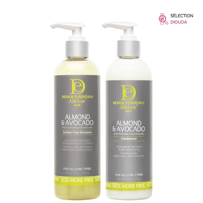 Programme de soins pour cheveux crépus, frisés, bouclés par Design Essential Natural. Un Shampoing + un Après-shampoing hydratants et démêlants aux amandes et à l'avocat pour revitaliser les cheveux naturels.