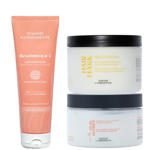 3 soins Madame La Présidente spécialement formulés pour ralentir la chute, renforcer, nourrir, hydrater les cheveux et définir les boucles.