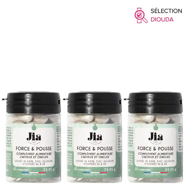 Pour une pousse de cheveux active, une cure de 3 mois de compléments alimentaires Force & Pousse Jia Paris aux actifs naturels apportent les nutriments nécessaires à votre organisme :