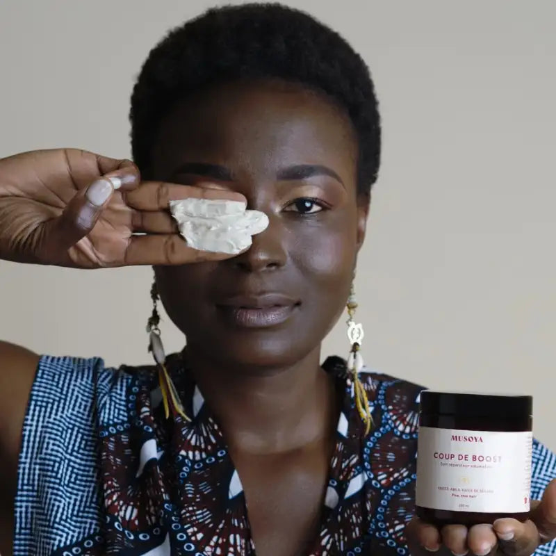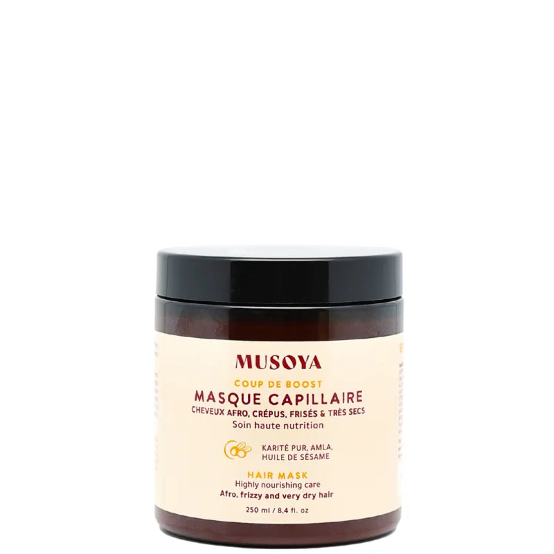 Enrichi en beurre de karité brut, poudre d’amla et huile de sésame, le Masque capillaire Musoya nourrit intensément, stimule la pousse et renforce la fibre capillaire. Sa texture riche pénètre en profondeur pour redonner vie aux cheveux les plus abîmés ou fins ou en manque de volume.