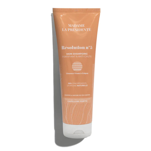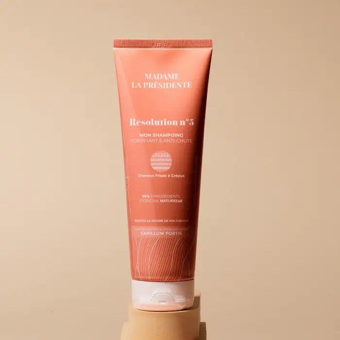 Le shampoing anti-chute Résolution N°5 de Madame La Présidente est composé à 95% d’ingrédients d’origine naturelle est enrichi en Capillum Fortis un mélange synergique de plantes qui stimule la circulation sanguine pour favoriser la croissance capillaire. Il renforce également l'ancrage des follicules capillaires, assurant des cheveux en meilleure santé dès la racine.