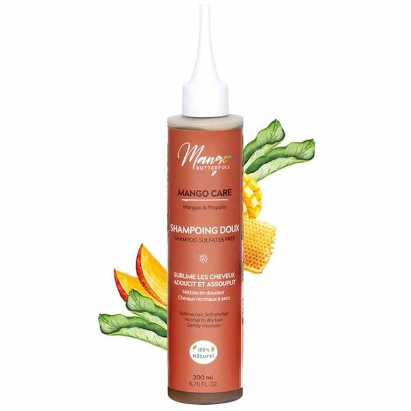 le Shampoing Doux Mango CARE est 100% naturel et mousse peu. Il est concentré et efficace même en petite quantité.