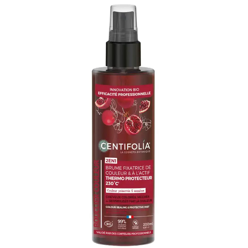 La Brume Fixatrice de Couleur et Thermoprotecteur Centifolia protège votre couleur jusqu'à 6 semaines et agit comme un bouclier thermique.