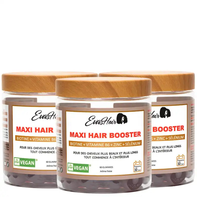Pour booster efficacement la croissance de vos cheveux, une Cure de 3 mois avec les Gummies MAXI HAIR BOOSTER EvasHair est la période minimale requise pour un résultat probant.